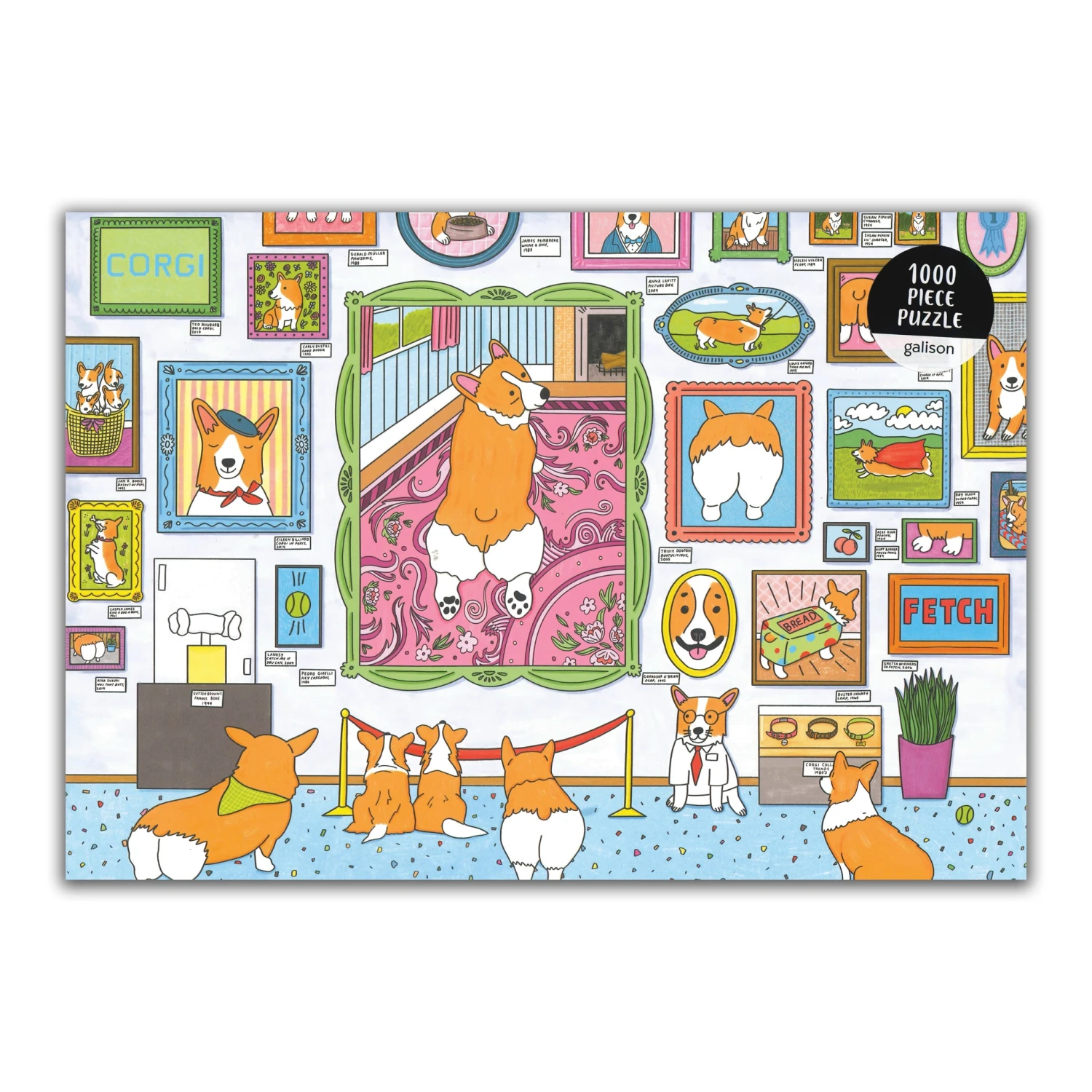 The Museum of the Corgi 1000 Piece Puzzle features bright and bold illustrations of adorable corgis roaming a museum. Galison puzzles are packaged in matte-finish sturdy boxes, perfect for gifting, reuse, and storage. An insert of the full puzzle image is also included.