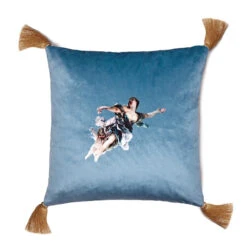 Inspired by Francois Boucher’s ‘The Rising of the Sun’ the cushion features one of the naiads that is seen circling Apollo, on a crisp, bright blue velvet cushion with gold tassels.