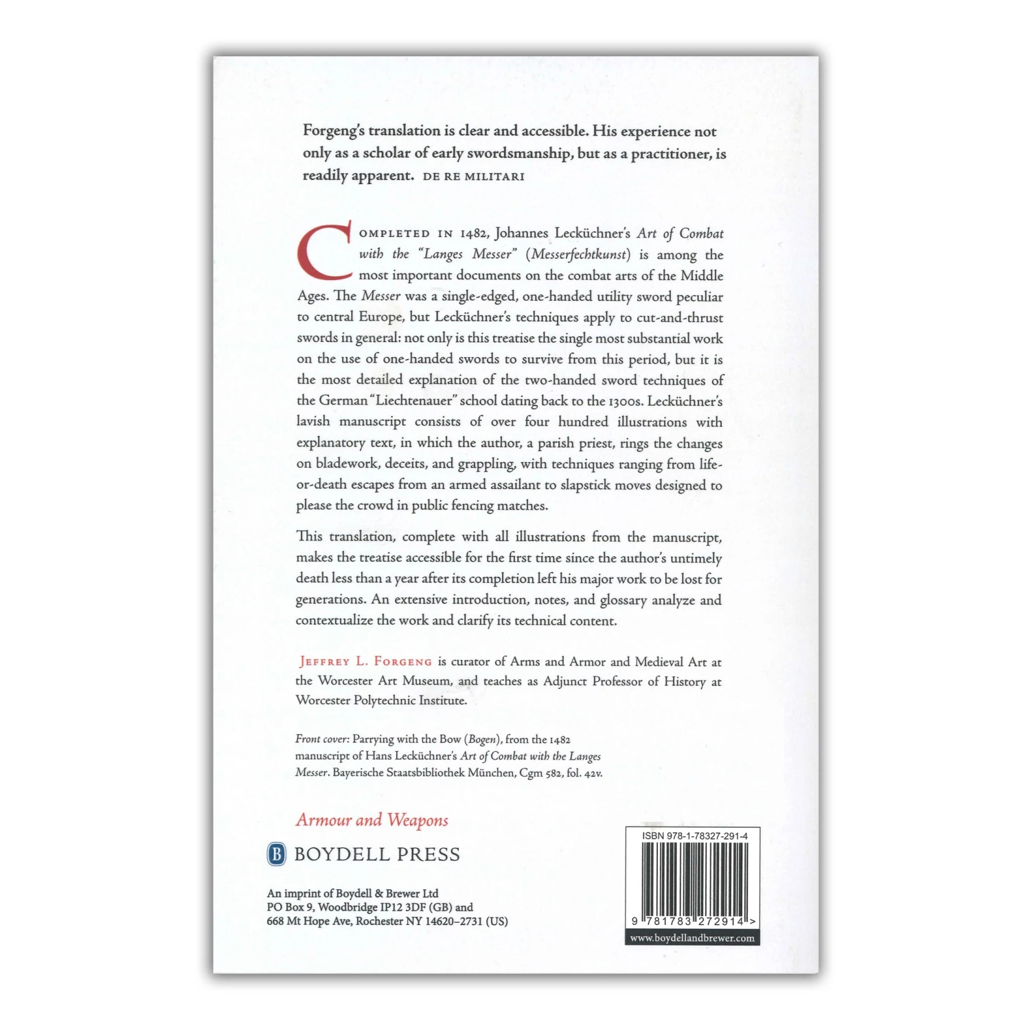 Completed in 1482, Johannes LeckĂŒchner’s Art of Combat with the « Langes Messer » (Messerfechtkunst) is among the most important documents on the combat arts of the Middle Ages. The Messer was a single-edged, one-handed utility sword peculiar to central Europe, but LeckĂŒchner’s techniques apply to cut-and-thrust swords in general: not only is this treatise the single most substantial work on the use of one-handed swprds to survive from this period, but it is the most detaield explanation of the two-handed sword techniques of the German « Liechtenauer » school dating back to the 1300s. LeckĂŒchner’s lavish manuscripts consists of over four hundred illustrations with explanatory text, in which the author, a parish priest, rings the changes on bladework, deceits and grappling, with techniques ranging from life-or-death escapes from an armed assailant to slapstick moves designed to please the crowd in public fencing matches.Â