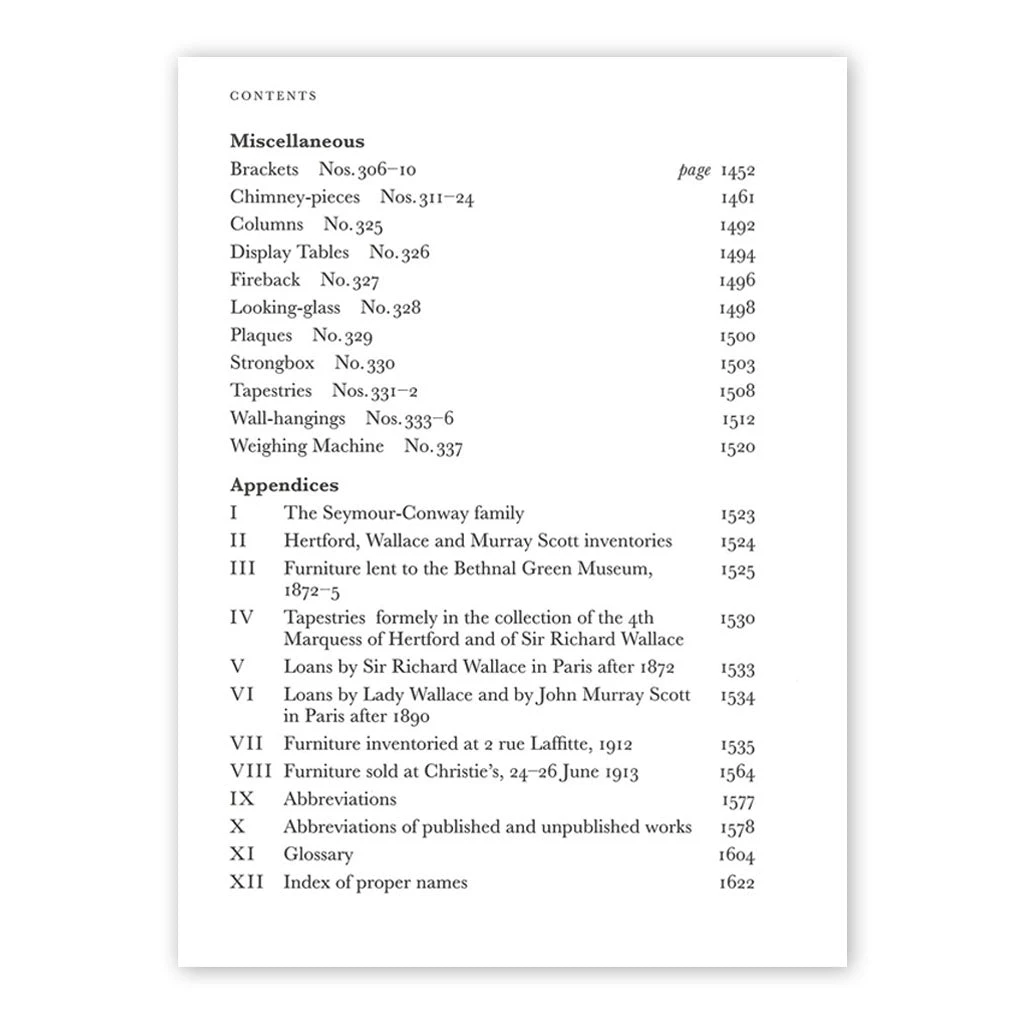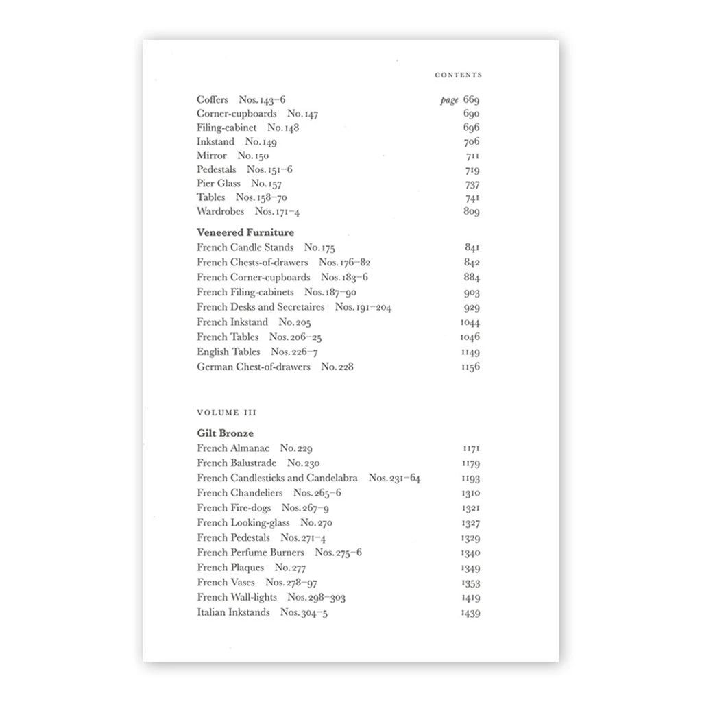 Volume One comprises Gothic and Renaissance-style furniture, carved furniture, lacquer furniture and clocks and barometes. Volume Two covers Boulle, and veneered furniture whilst Volume Three focuses on gilt bronze.