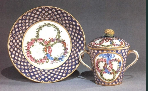 This design is taken from a Sèvres Porcelain saucer dated 1766 and shows a ground pattern invented by the porcelain painter Vincent Taillandier (1736-1790). The original porcelain saucer is housed in the Back State Room at the Wallace Collection.